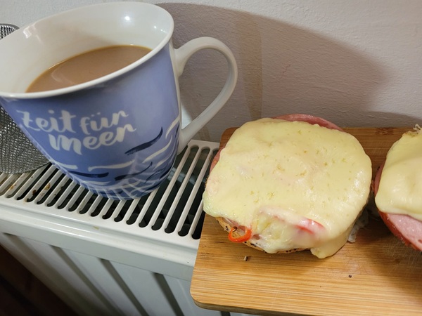 Die Schwester musste sich schon wieder auf den Heimweg machen, was an sich kein schönes Ereignis für mich war. Zum Glück musste sie erst nach halb elf mit dem Zug los, so dass wir noch Zeit hatten für ein schönes kleines Frühstück auf meinem Balkon. Auch der Sohn kam hinzu. Ich bereitete Rührei mit Schinken. Ein schöner Tagesbeginn. Da ich die Zugverbindungen über die Bahn-App immer wieder überprüfte und ihr per WhatsApp weitergab, waren wir noch den ganzen Tag miteinander verbandelt. Positiv fiel auf, dass alle Anschlüsse pünktlich verliefen.
