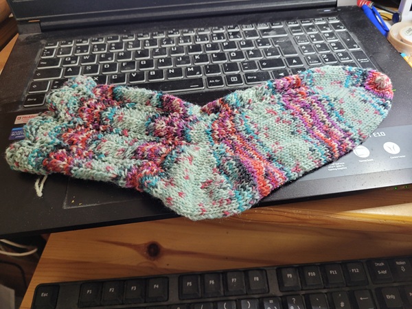 Insgesamt ist es das Paar Nr. 05/2026 im Sommerstinomuster mit 63 Maschen, Größe 36/37 für mich. So!