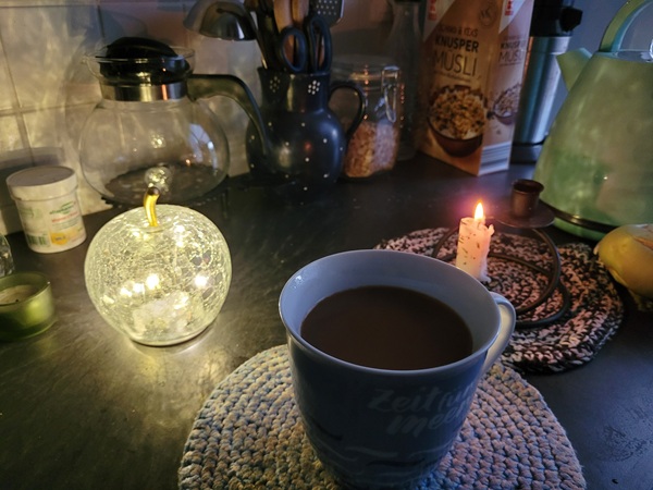 Frühstück allein. RoHen hat die ganze Nacht nicht geschlafen und sich jetzt mal noch hin gelegt.